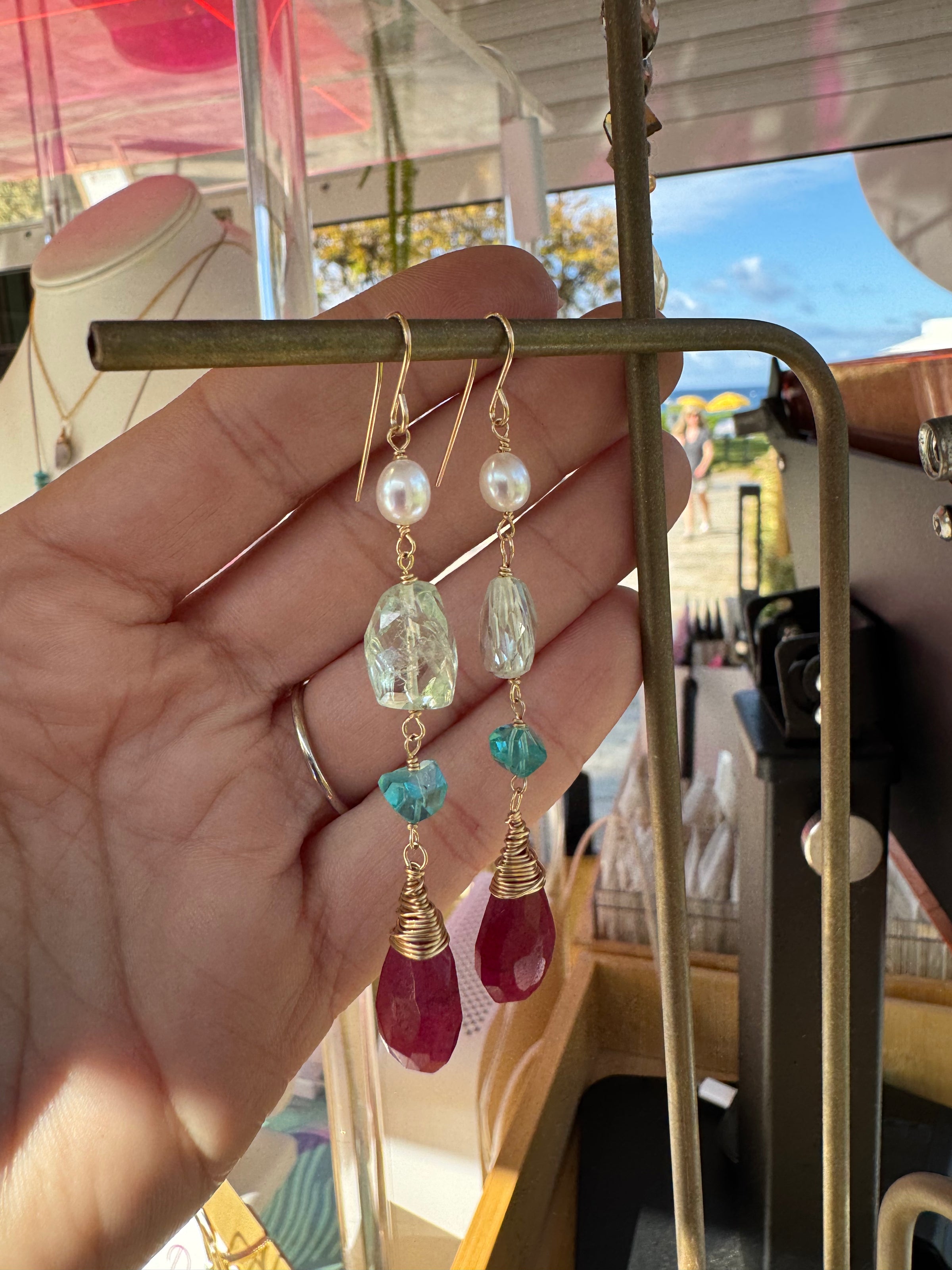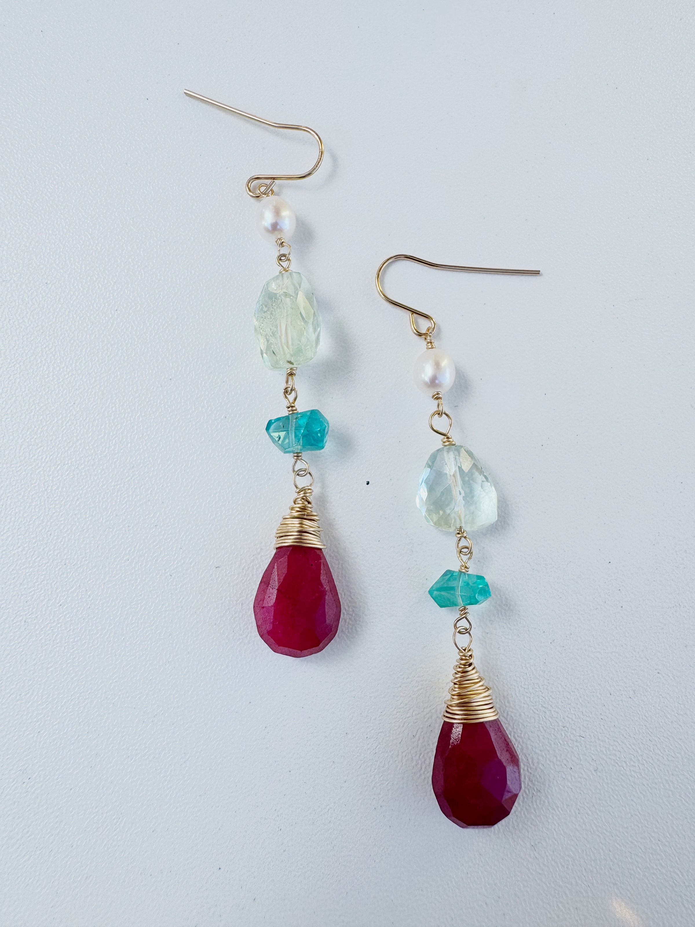 Pearl, aquamarine and ruby drop Earrings